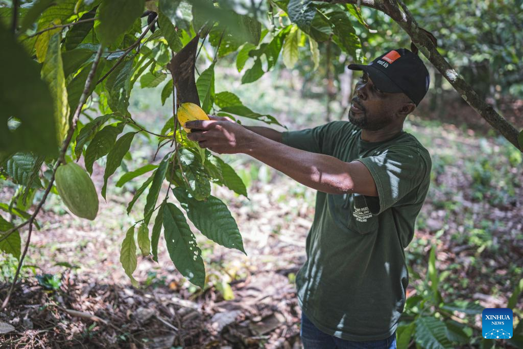 This photo taken on May 27, 2025 shows a farmer harvesting cocoa fruit at a planting garden in Abidjan, Cote d'Ivoire. (Xinhua/Wang Guansen)