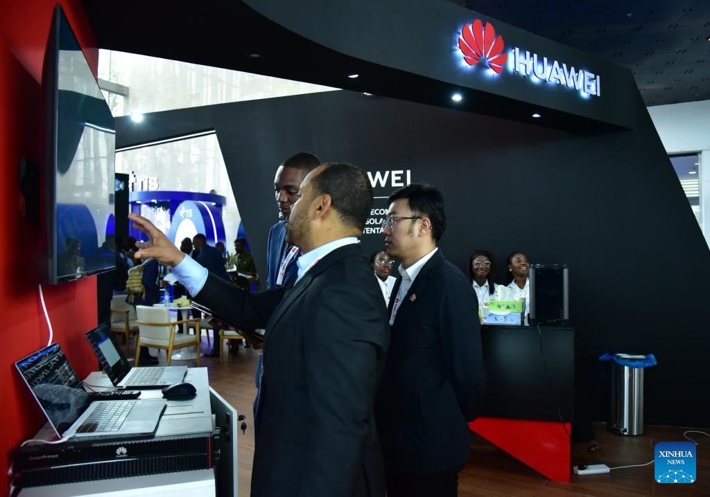 People visit the booth of Huawei during the Angola International Forum on Information and Communication Technologies 2025 in Luanda, Angola, June 12, 2025. The fifth edition of the Angola International Forum on Information and Communication Technologies kicked off on Thursday in Luanda, the capital, under the theme: "50 years communicating, modernizing and developing Angola." (Photo by Julio Kikebu/Xinhua)