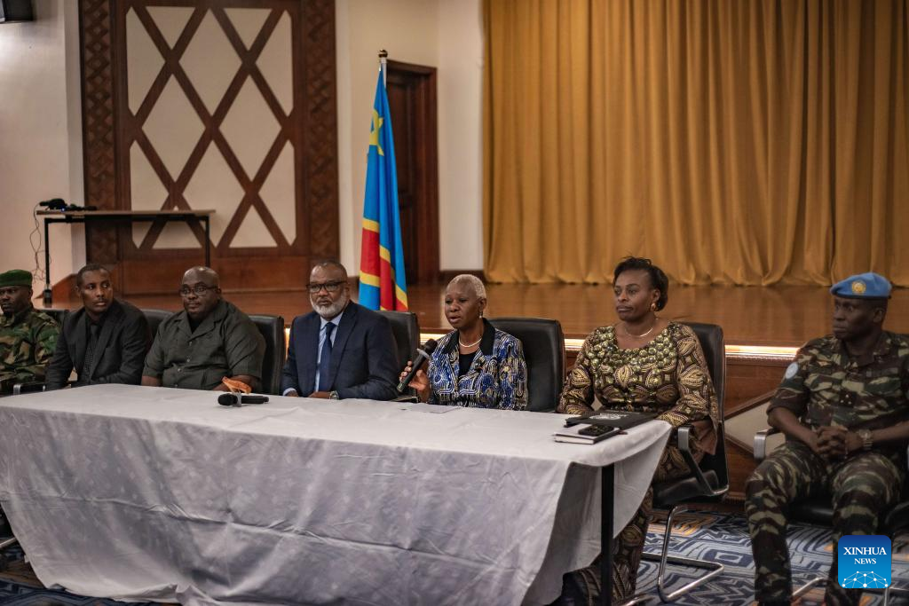 Bintou Keita (3rd, R), special representative of the UN Secretary-General in the Democratic Republic of the Congo (DRC), attends a press briefing in Goma, eastern DRC, on June 13, 2025. Leaders of the rebel group, March 23 Movement, have expressed their willingness to resolve the ongoing crisis in eastern Democratic Republic of the Congo (DRC) through peaceful means, the senior United Nations official said Friday. (Str/Xinhua)
