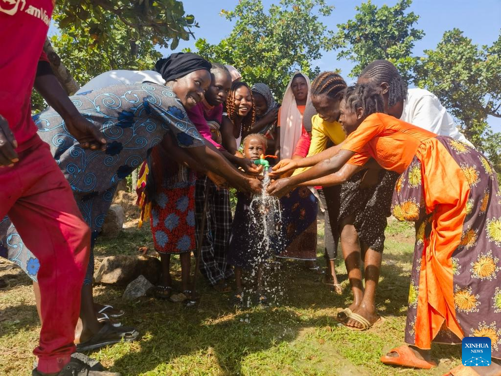 This file photo taken on Oct. 9, 2024 shows local residents feeling the water with their hands during the trial run of the Greater Abuja Water Supply Network project in Abuja, Nigeria. Nigerian President Bola Tinubu has commissioned a China-assisted water supply project in Abuja, the national capital, and pledged commitment to sustainable infrastructure that directly improves citizens' lives. Executed by Chinese firm CGCOC GROUP Co., Ltd., the 470-million-U.S.-dollar Greater Abuja Water Supply Network, Loops 1, 2, 5, and 6, was commissioned on Monday.(CGC Nigeria/Handout via Xinhua)