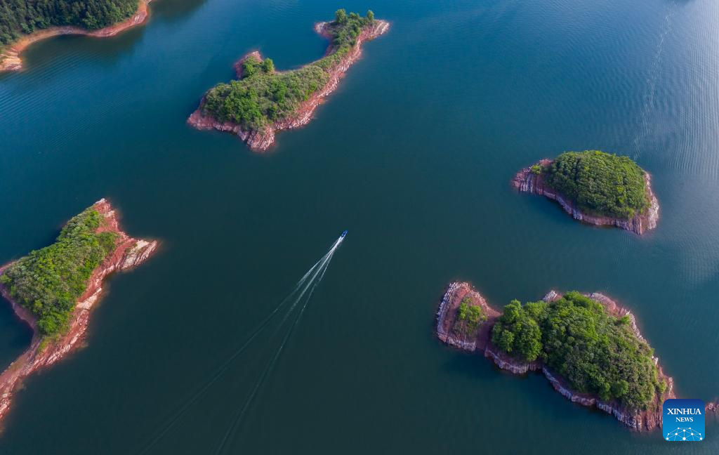 An aerial drone photo taken on June 3, 2025 shows a view of the Qiandao Lake in east China's Zhejiang Province. Chun'an, located in east China's Zhejiang Province, is renowned for its water system and outstanding natural environment. As a national-level ecological county, it serves as a model for ecological protection and construction. (Xinhua/Xu Yu)