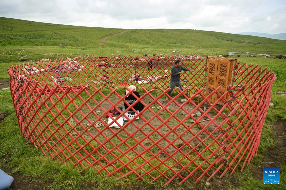 Balatijan Eremubai (R) sets up a yurt on the summer pasture in Xinyuan County, northwest China's Xinjiang Uygur Autonomous Region, June 11, 2025, the second day of summer transfer. Xinjiang, home to lush pastures, is one of China's key livestock production base. The Ili River Valley on the northern slopes of the Tianshan Mountains boasts abundant grassland resources. Every June, local herders took their livestock to summer pastures at higher altitudes where grass is abundant.