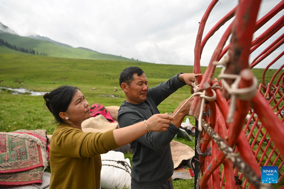 Balatijan Eremubai (L) and his wife build a yurt on the summer pasture in Xinyuan County, northwest China's Xinjiang Uygur Autonomous Region, June 11, 2025, the second day of summer transfer. Xinjiang, home to lush pastures, is one of China's key livestock production base. The Ili River Valley on the northern slopes of the Tianshan Mountains boasts abundant grassland resources. Every June, local herders took their livestock to summer pastures at higher altitudes where grass is abundant.