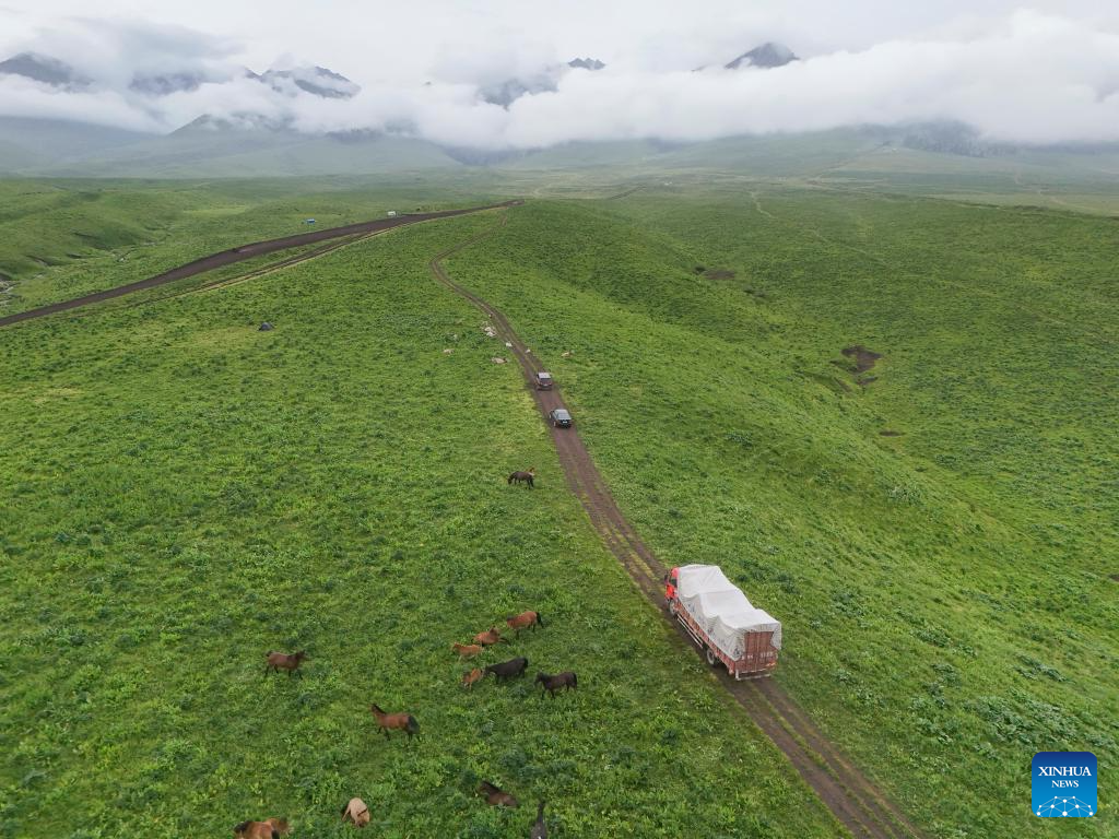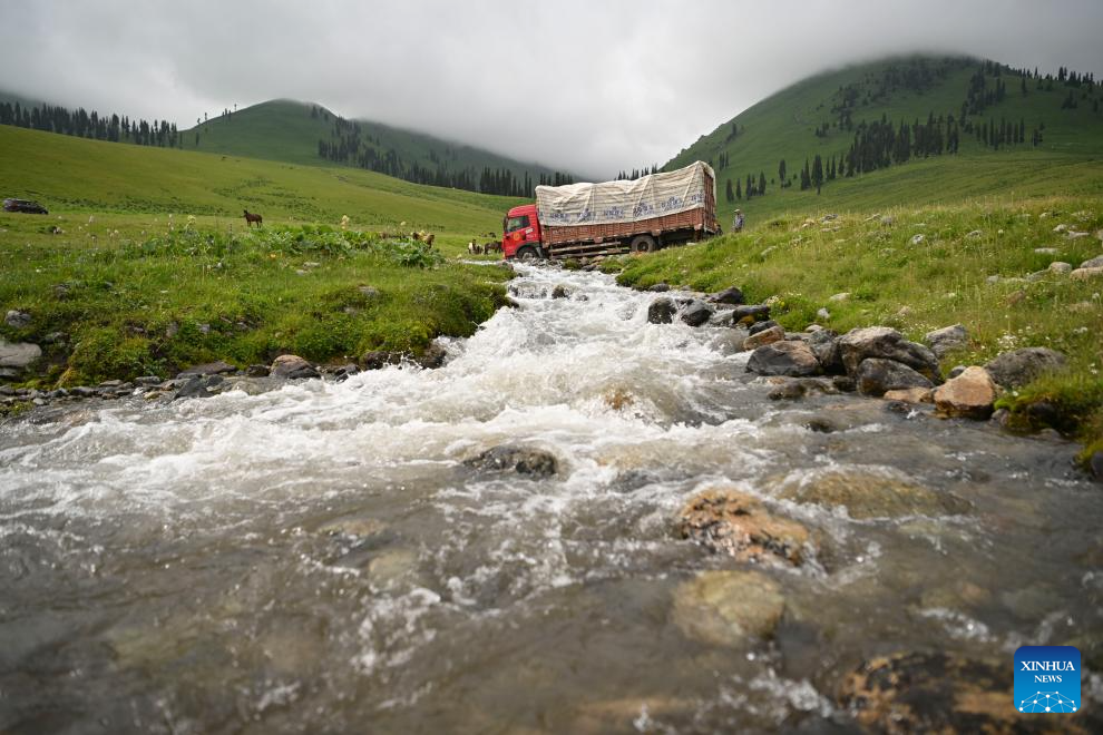 A truck carrying the yurt and other materials of Balatijan Eremubai moves on grassland in Xinyuan County, northwest China's Xinjiang Uygur Autonomous Region, June 11, 2025, the second day of summer transfer. Xinjiang, home to lush pastures, is one of China's key livestock production base. The Ili River Valley on the northern slopes of the Tianshan Mountains boasts abundant grassland resources. Every June, local herders took their livestock to summer pastures at higher altitudes where grass is abundant.