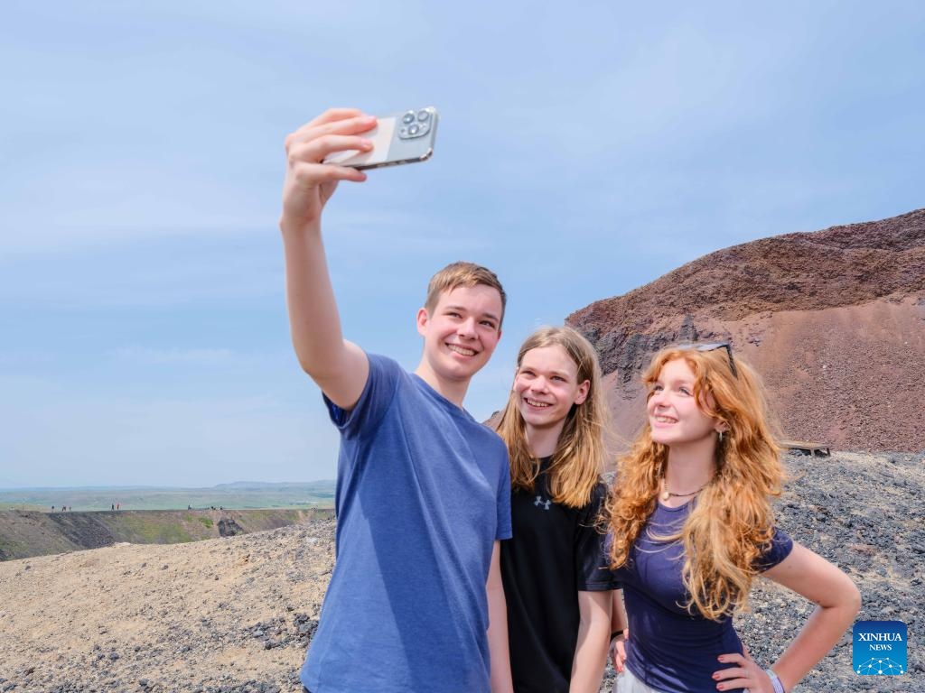 Tourists from the U.S. take a selfie in front of a volcano of the Ulanhada volcano cluster in Qahar Right Wing Rear Banner of Ulanqab, north China's Inner Mongolia Autonomous Region, June 17, 2025. The Ulanhada volcano cluster boasts special geological landscapes such as volcanoes and lava landform. With summer's arrival, it has entered the peak tourist season. (Xinhua/Ma Jinrui)