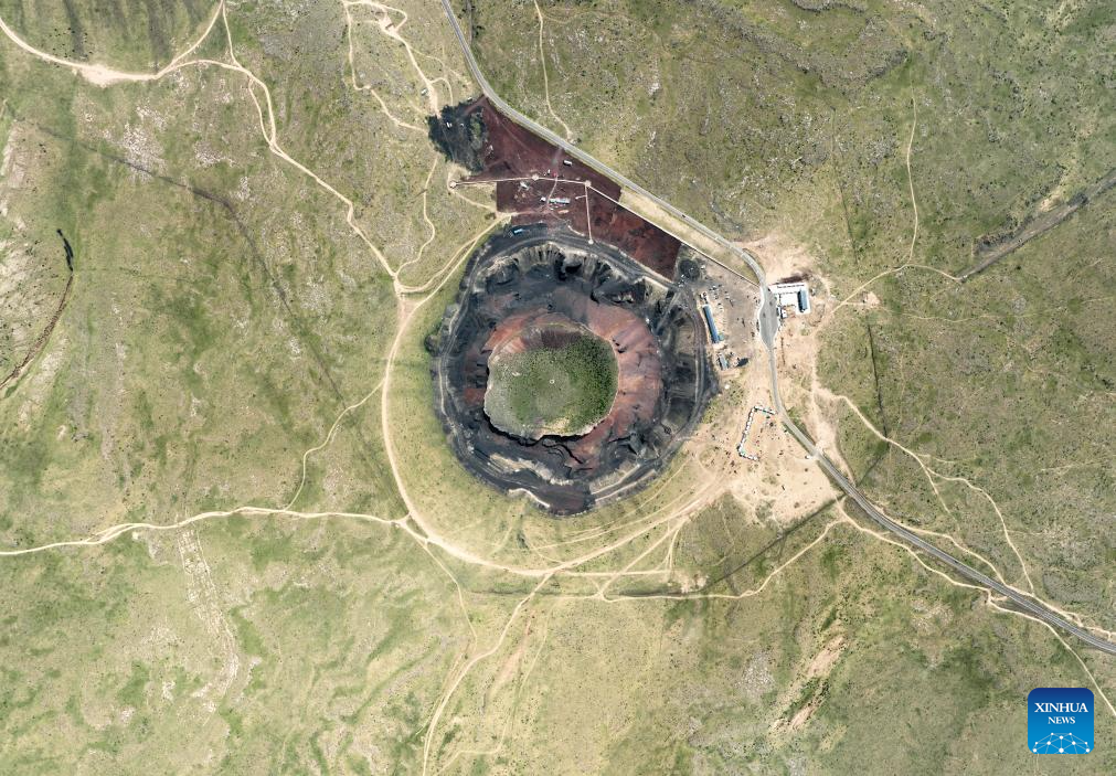 An aerial drone photo taken on June 17, 2025 shows a view of the Ulanhada volcano cluster, Qahar Right Wing Rear Banner of Ulanqab, north China's Inner Mongolia Autonomous Region. The Ulanhada volcano cluster boasts special geological landscapes such as volcanoes and lava landform. With summer's arrival, it has entered the peak tourist season. (Xinhua/Ma Jinrui)