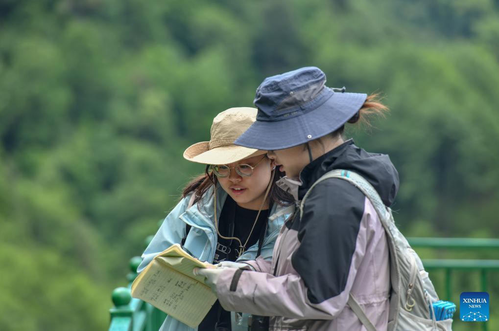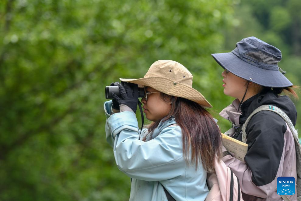 Postgraduate students from the China West Normal University records the traces of the black-and-white snub-nosed monkeys at the Baima Snow Mountain National Nature Reserve in Deqen Tibetan Autonomous Prefecture, southwest China's Yunnan Province, June 15, 2025. The black-and-white snub-nosed monkey, also known as the Yunnan golden hair monkey, is a national first-class protected animal of China. The species is also on the Red List of the International Union for Conservation of Nature (IUCN).