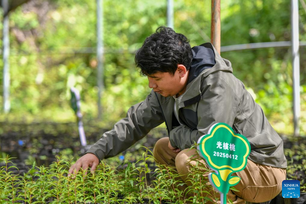 A staff member from the Baima Snow Mountain National Nature Reserve checks the growing condition of seedlings for feeding the black-and-white snub-nosed monkeys in Deqen Tibetan Autonomous Prefecture, southwest China's Yunnan Province, June 15, 2025. The black-and-white snub-nosed monkey, also known as the Yunnan golden hair monkey, is a national first-class protected animal of China. The species is also on the Red List of the International Union for Conservation of Nature (IUCN).