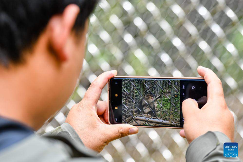 A staff member from the Baima Snow Mountain National Nature Reserve records a rescued black-and-white snub-nosed monkey in Deqen Tibetan Autonomous Prefecture, southwest China's Yunnan Province, June 15, 2025. The black-and-white snub-nosed monkey, also known as the Yunnan golden hair monkey, is a national first-class protected animal of China. The species is also on the Red List of the International Union for Conservation of Nature (IUCN).