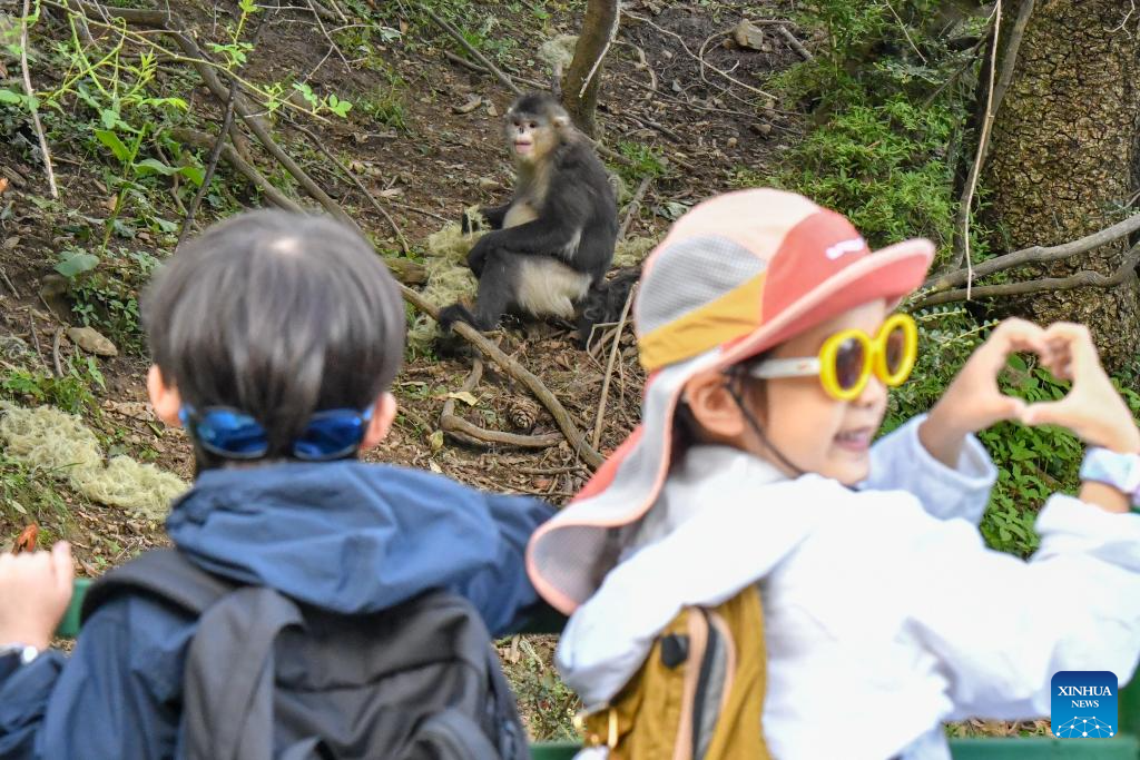 Visitors pose with a black-and-white snub-nosed monkey at the Baima Snow Mountain National Nature Reserve in Deqen Tibetan Autonomous Prefecture, southwest China's Yunnan Province, June 15, 2025. The black-and-white snub-nosed monkey, also known as the Yunnan golden hair monkey, is a national first-class protected animal of China. The species is also on the Red List of the International Union for Conservation of Nature (IUCN).