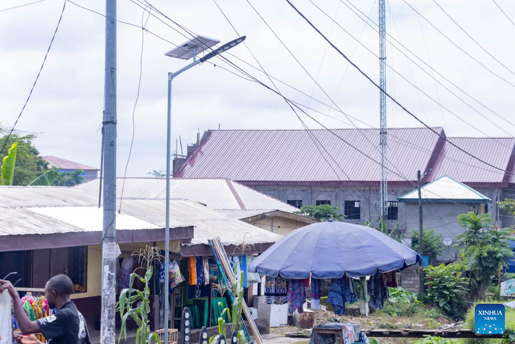 This photo taken on June 17, 2025 shows a solar street light in Buea, Southwest Region, Cameroon. (Photo by Muleng Timngum/Xinhua)