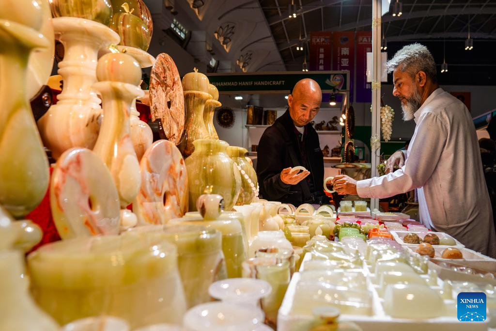 A visitor selects jade products at the exhibition area of Pakistan at the South Asia Pavilion during the 9th China-South Asia Expo in Kunming, southwest China's Yunnan Province, June 20, 2025.