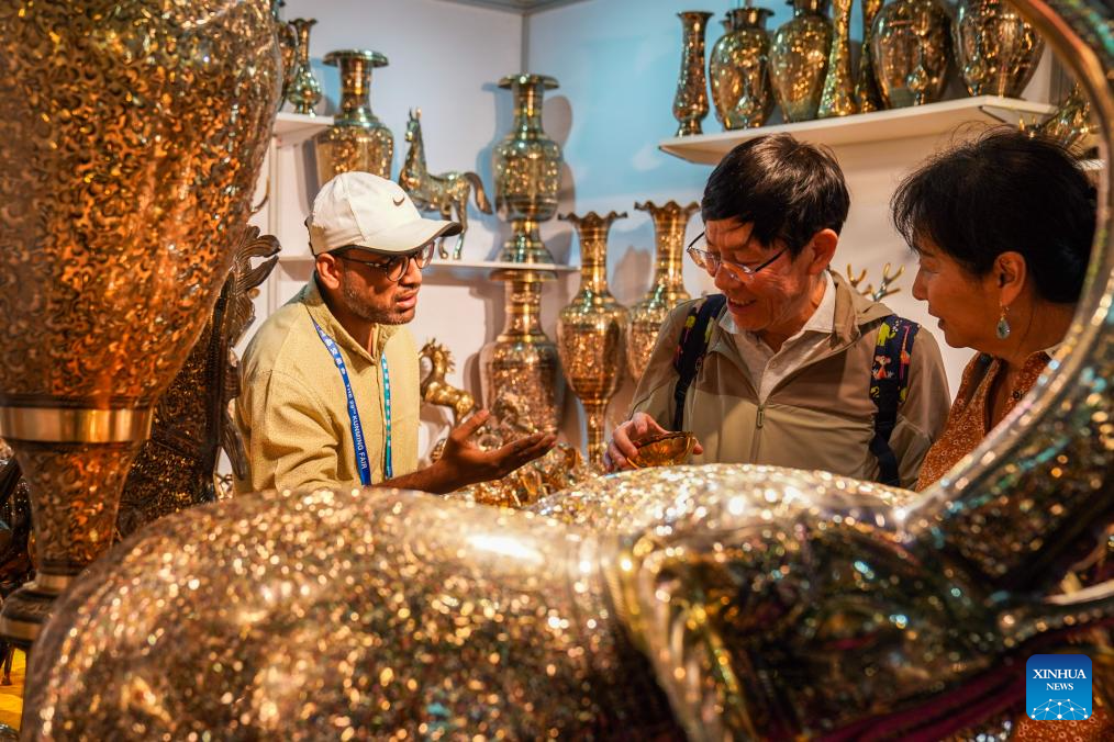 An exhibitor (C) promotes handmade slippers to visitors at the exhibition area of Pakistan at the South Asia Pavilion during the 9th China-South Asia Expo in Kunming, southwest China's Yunnan Province, June 21, 2025.
