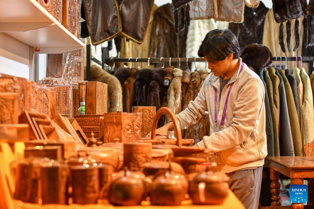 An exhibitor arranges products at the exhibition area of Pakistan at the South Asia Pavilion during the 9th China-South Asia Expo in Kunming, southwest China's Yunnan Province, June 21, 2025.