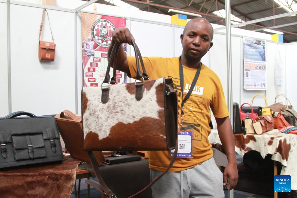 A trader from Zimbabwe showcases leather products at a trade fair in Bulawayo, Zimbabwe, on April 25, 2025. (Xinhua/Tafara Mugwara)