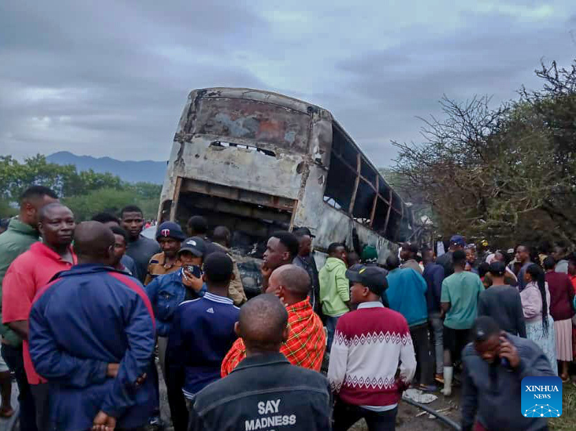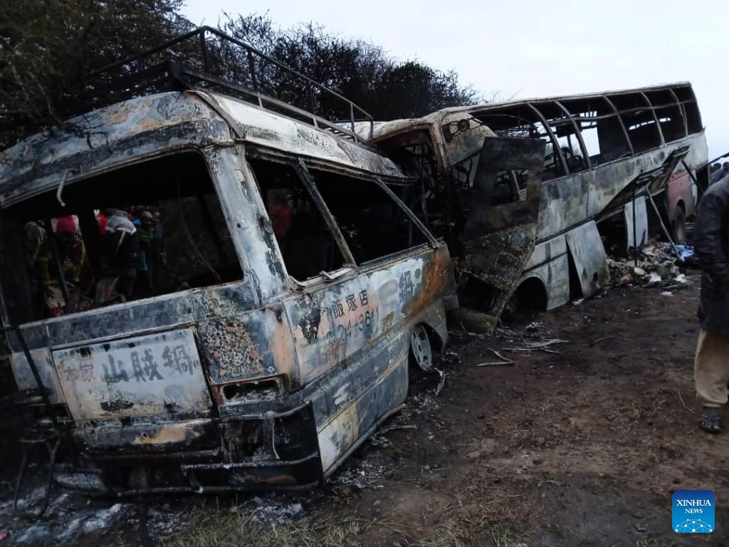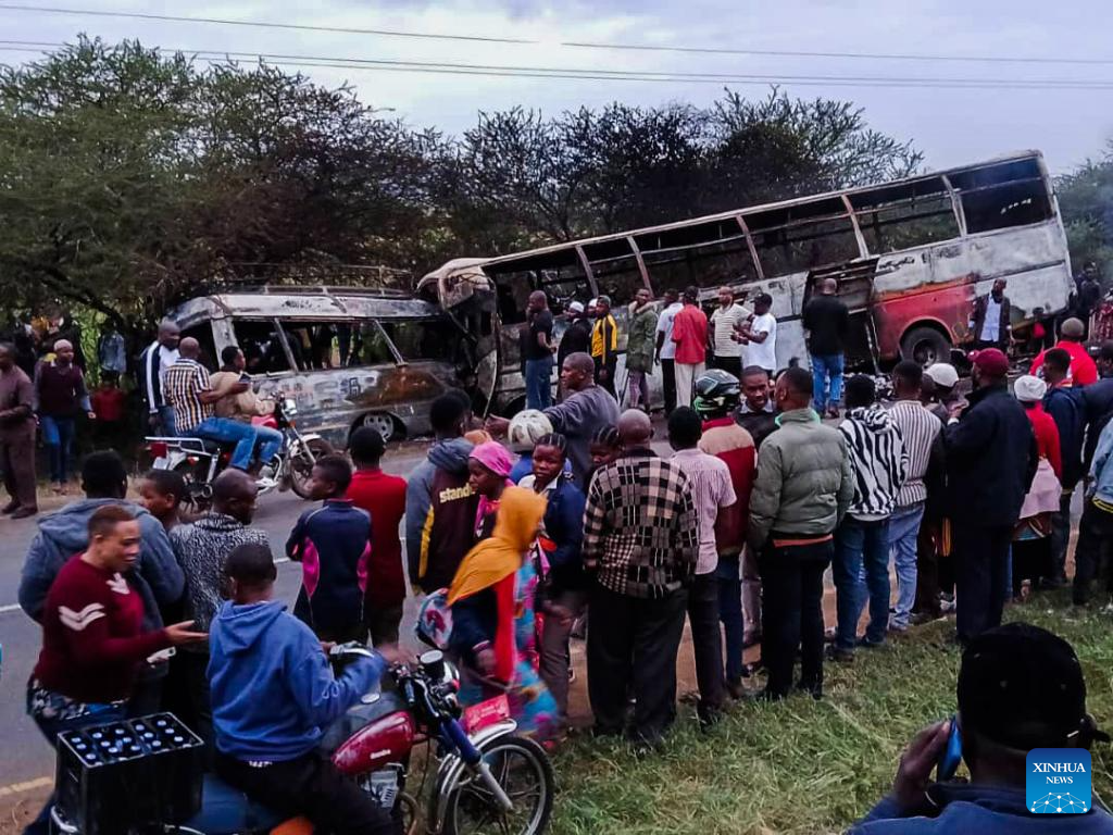 At least 38 people were killed and 28 others injured on Saturday evening when two buses collided head-on and burst into flames in Moshi district in Tanzania's northern region of Kilimanjaro. (Xinhua)