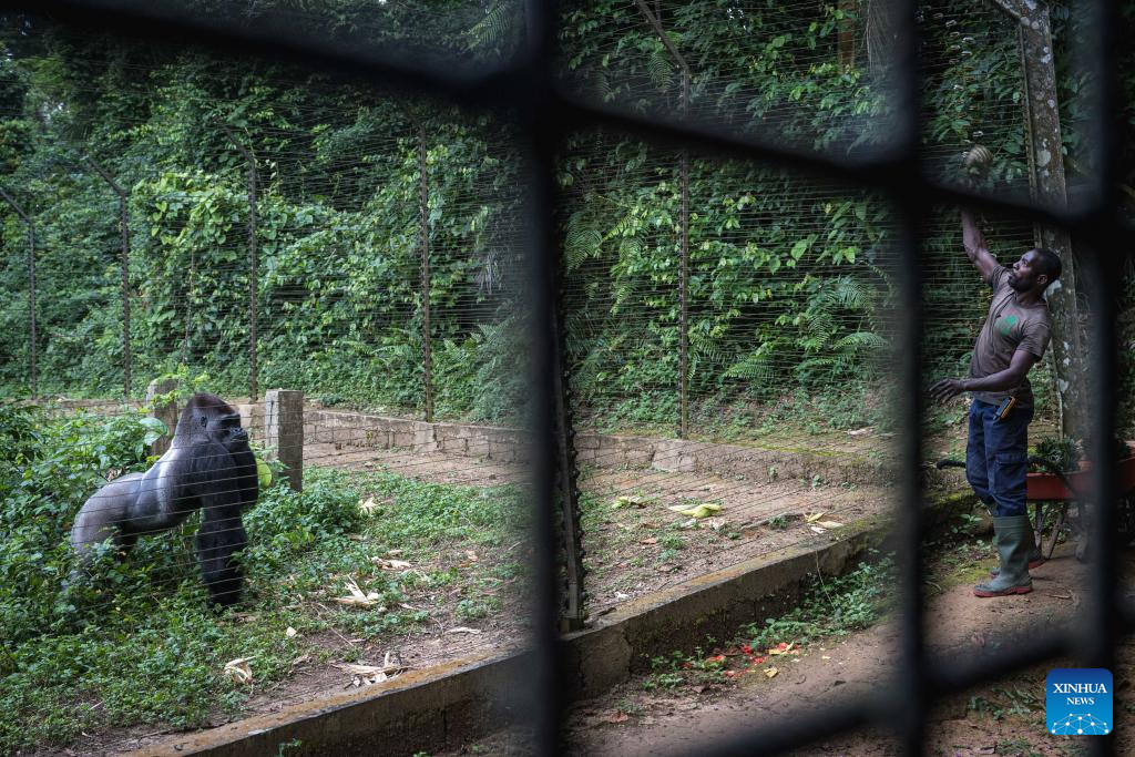 A staff member delivers food for western lowland gorillas at the Mefou Primate Sanctuary in Yaounde, the capital of Cameroon, on July 1, 2025. Located in the south of Yaounde, the Mofu Primate Sanctuary aims to protect primates that have been maimed or left alone due to illegal hunting and trading. (Xinhua/Wang Guansen)