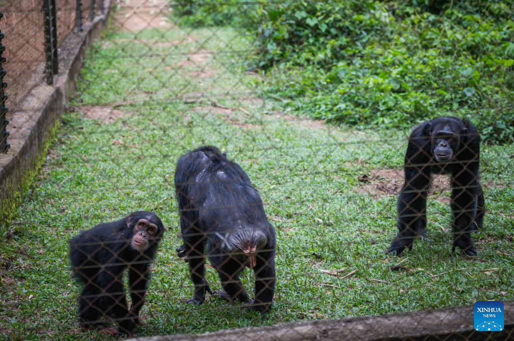 This photo taken on July 1, 2025 shows chimpanzees at the Mofu Primate Sanctuary in Yaounde, the capital of Cameroon. Located in the south of Yaounde, the Mofu Primate Sanctuary aims to protect primates that have been maimed or left alone due to illegal hunting and trading. (Xinhua/Wang Guansen)
