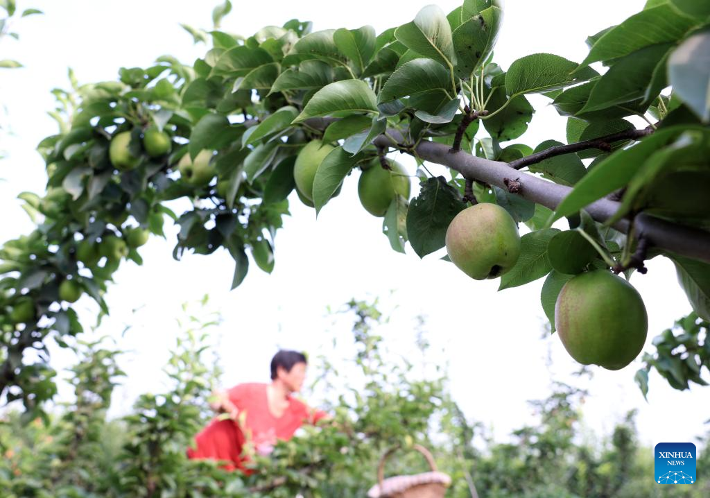 A farmer picks pears at an orchard in Zhaoxian County, north China's Hebei Province, July 8, 2025. In recent years, Zhaoxian County has actively guided fruit farmers to develop pear cultivation, so as to promote farmers' income and rural revitalization. (Xinhua/Yang Shiyao)