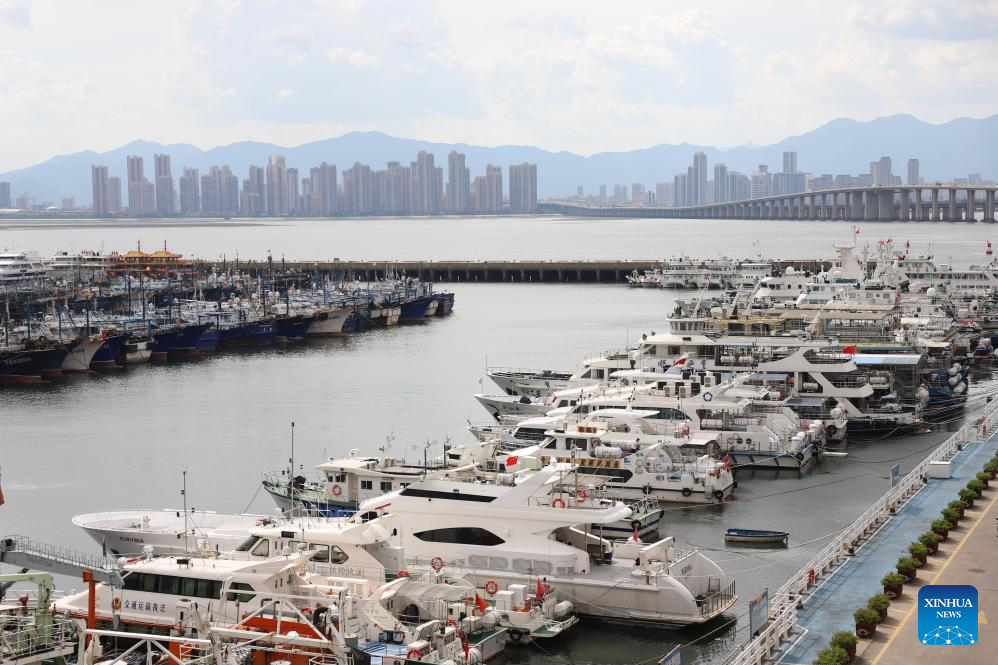 Vessels moor at a port to shelter from an approaching typhoon in Xiamen, southeast China's Fujian Province, July 6, 2025. China's Ministry of Water Resources on Monday activated a Level-IV emergency response to flooding in the eastern provinces of Zhejiang and Fujian as Typhoon Danas approaches. (Photo by Zeng Demeng/Xinhua)