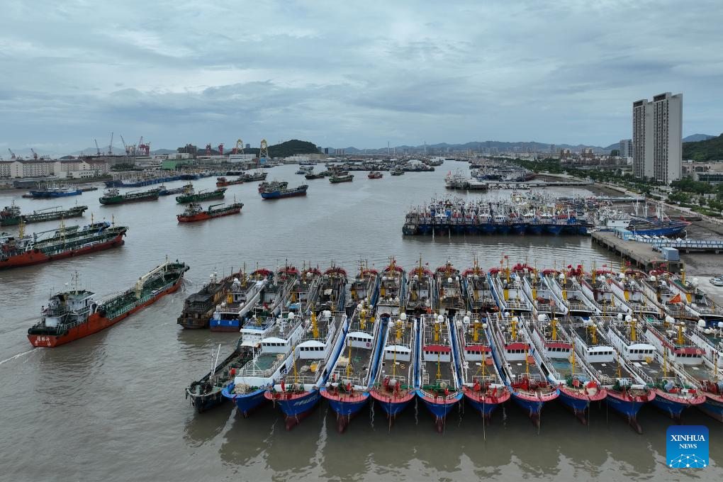 This aerial drone photo taken on July 6, 2025 shows vessels mooring at a port to shelter from an approaching typhoon in Fuzhou, southeast China's Fujian Province. China's Ministry of Water Resources on Monday activated a Level-IV emergency response to flooding in the eastern provinces of Zhejiang and Fujian as Typhoon Danas approaches. (Photo by Wang Wangwang/Xinhua)