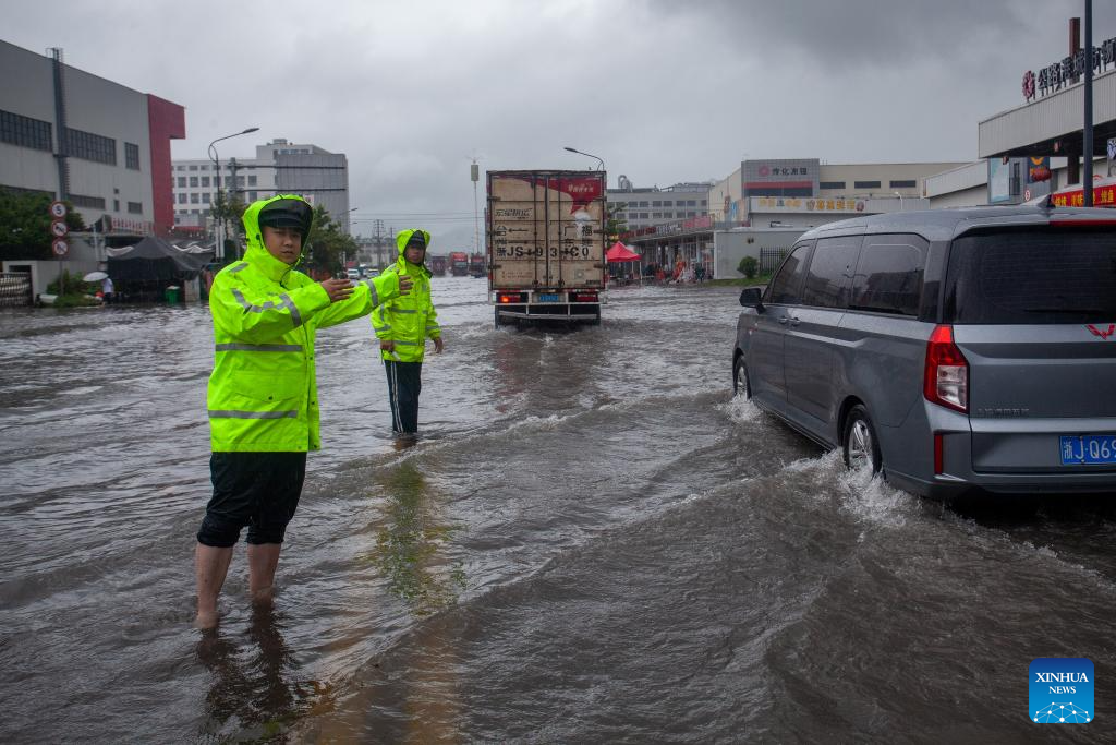 Police officers are pictured on duty on a waterlogged road in Huangyan District of Taizhou, east China's Zhejiang Province, July 8, 2025. China's Ministry of Water Resources on Monday activated a Level-IV emergency response to flooding in the eastern provinces of Zhejiang and Fujian as Typhoon Danas approaches. (Photo by Yu Yuexiang/Xinhua)