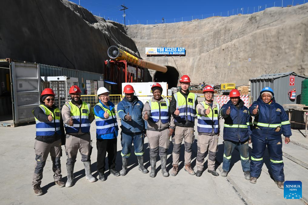 Workers from China and Lesotho pose for a group photo at the construction site of the Tunnel Boring Machine Access Adit for Polihali Transfer Tunnel Project in Mokhotlong District, eastern Lesotho, July 7, 2025.(Xinhua/Yang Guang)