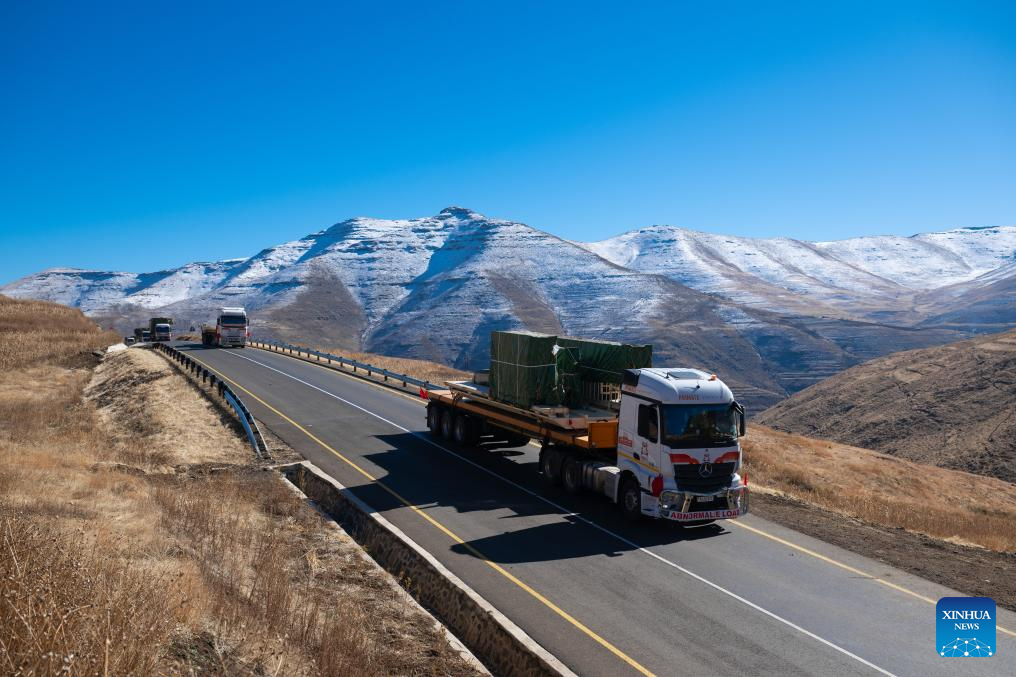 Trucks transport components of a China-manufactured hard-rock shielded tunnel boring machine (TBM) on a mountain road in Thaba-Tseka District, eastern Lesotho, July 8, 2025.(Xinhua/Yang Guang)