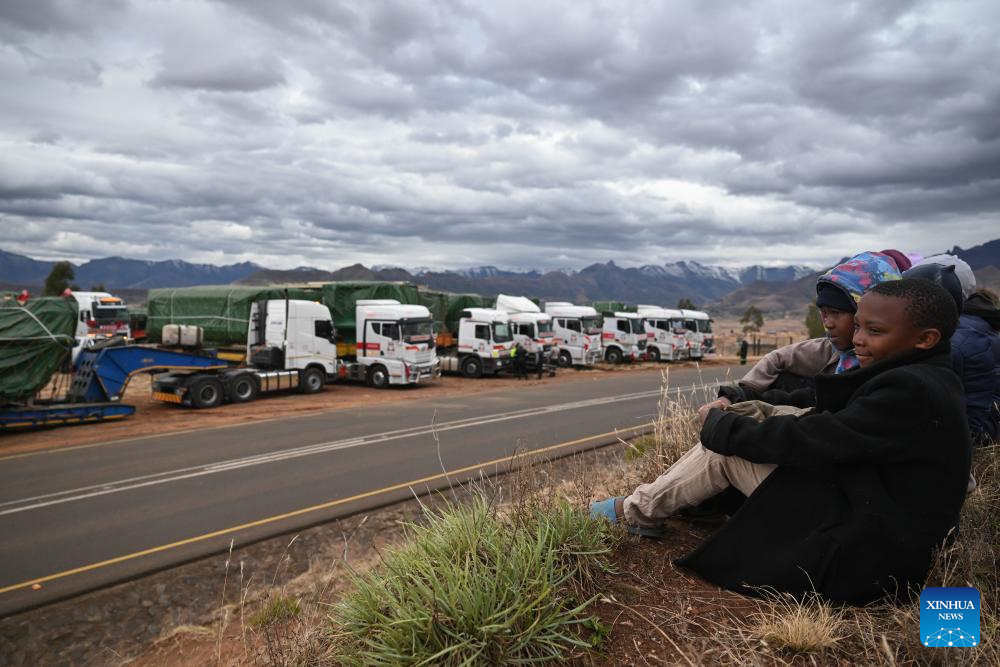 Children wave as trucks transport components of a China-manufactured hard-rock shielded tunnel boring machine (TBM) in Thaba-Tseka District, eastern Lesotho, July 8, 2025.(Xinhua/Yang Guang)