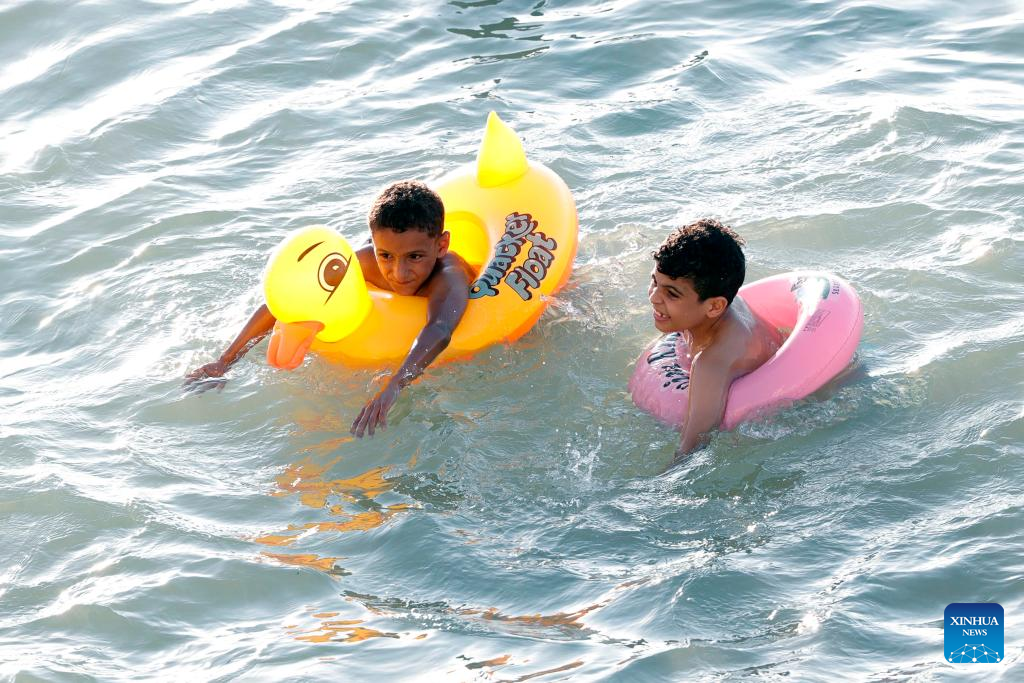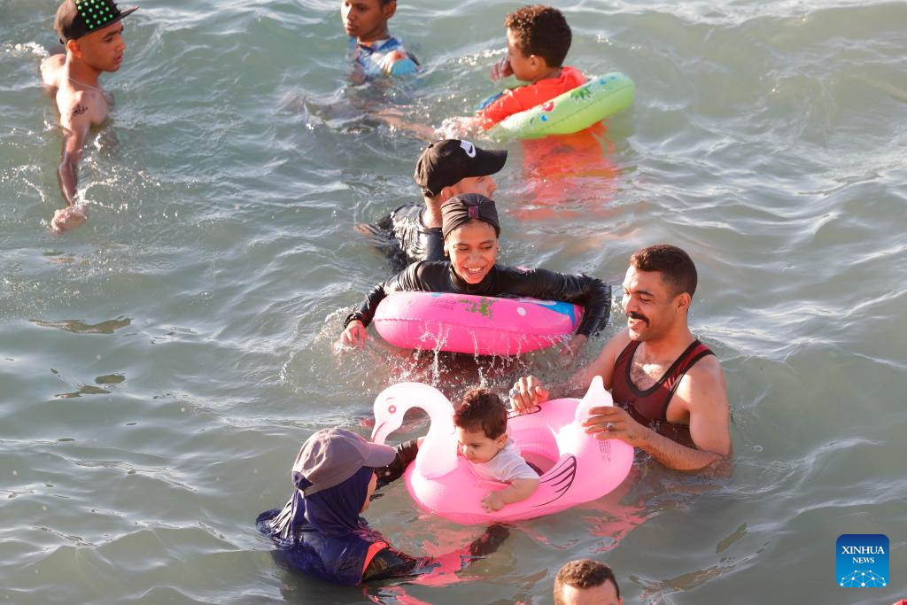 People cool off at a beach of the Mediterranean Sea during a heatwave in Alexandria, Egypt, on July 16, 2025. Egypt is experiencing an exceptional heatwave, with high temperatures and humidity posing significant risks to public health and impacting key sectors such as agriculture and industry. (Xinhua/Ahmed Gomaa)