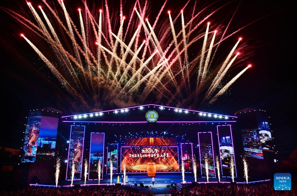 This photo taken on July 18, 2025 shows a fireworks performance during the opening ceremony of the 35th Qingdao International Beer Festival in Qingdao, east China's Shandong Province. The 30-day festival kicked off here on Friday, gathering over 2,300 domestic and foreign beer brands. The festival also features a series of activities, including art parades, craft beer competition, concerts, King of Beer competition, animation carnival and fashion sports festival. (Xinhua/Li Ziheng)