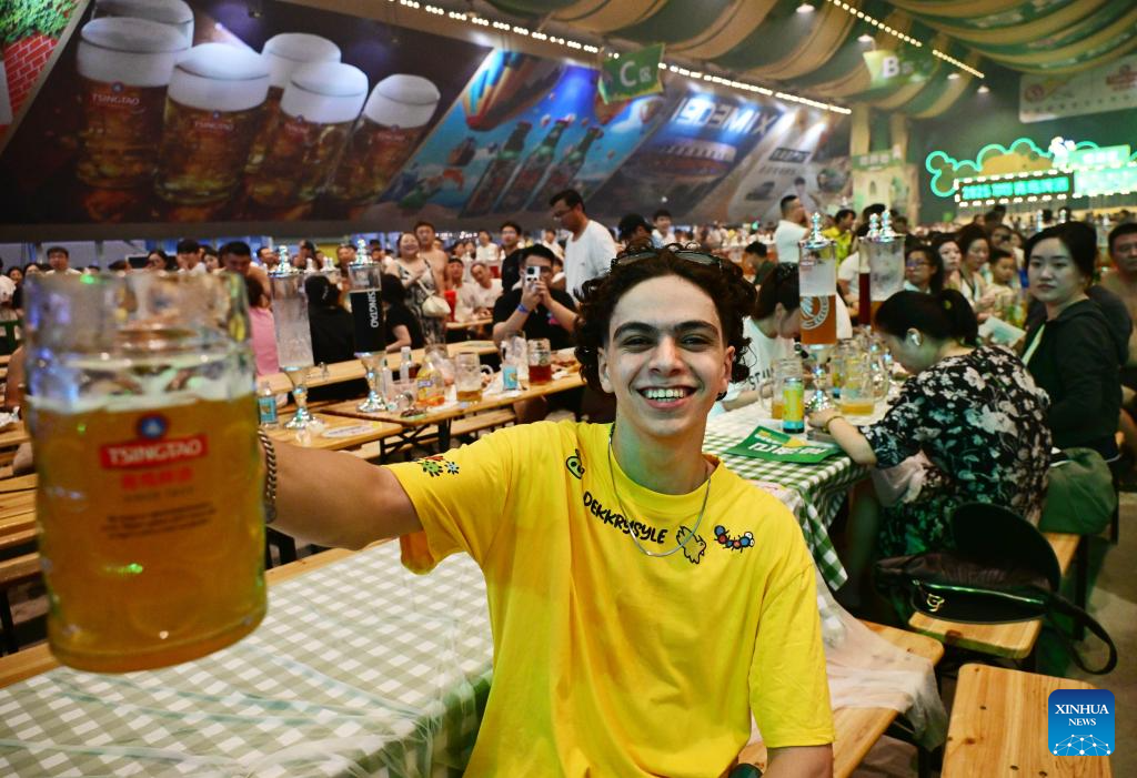 People enjoy beer during the 35th Qingdao International Beer Festival at the Xihai'an (West Coast) New Area in Qingdao, east China's Shandong Province, July 18, 2025. The 30-day festival kicked off here on Friday, gathering over 2,300 domestic and foreign beer brands. The festival also features a series of activities, including art parades, craft beer competition, concerts, King of Beer competition, animation carnival and fashion sports festival. (Xinhua/Li Ziheng)