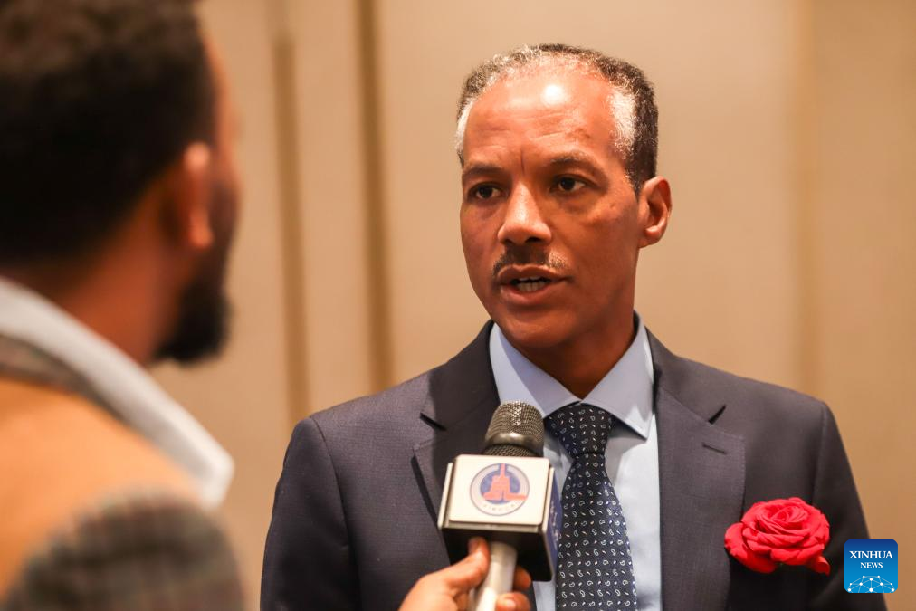 Dereje Derero, managing director of cargo and logistics services at Ethiopian Airlines, speaks during an interview with Xinhua in Addis Ababa, Ethiopia, on July 2, 2025. (Xinhua/Michael Tewelde)