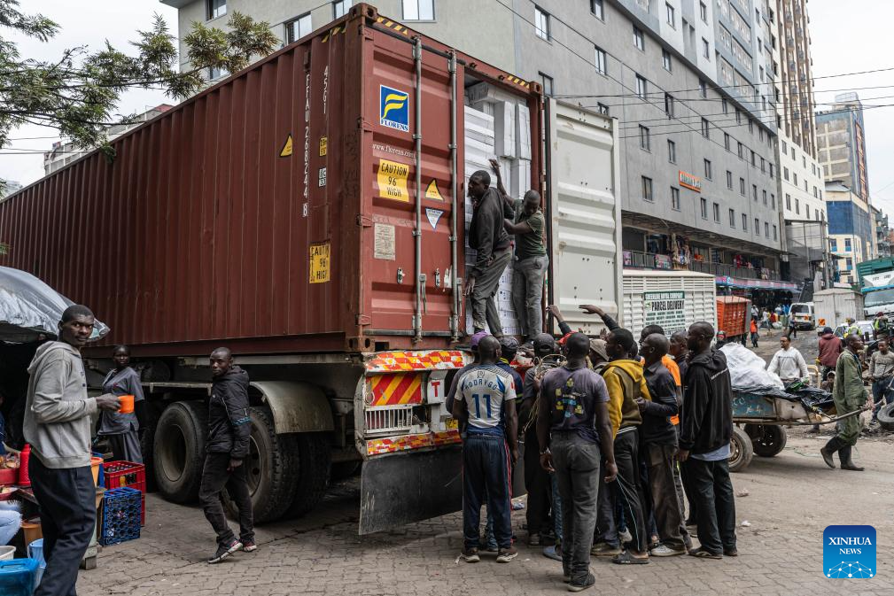 Porters unload goods from a truck at Eastleigh in Nairobi, Kenya, on July 23, 2025. Eastleigh, located in the eastern part of Nairobi, is a vibrant and densely populated commercial hub. (Xinhua/Wang Guansen)