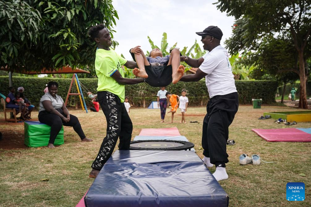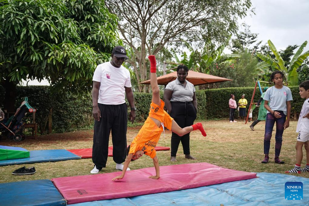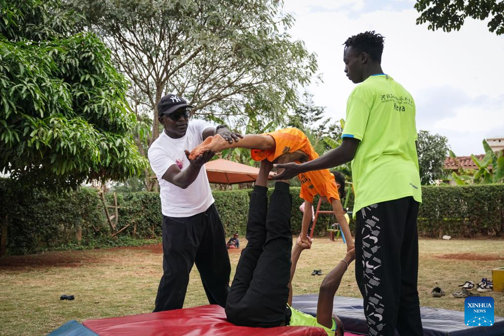 Kenyan acrobat Mathias Kavita (1st R) instructs a child to practice acrobatics in Thika, Kenya, on July 11, 2025. Slightly before his 12th birthday in 1983, Kavita's journey to China to study acrobatics under a government scholarship marked a turning point in his life, ushering him to a brave new world of cross-cultural interactions and enduring friendship.(Xinhua/Han Xu)