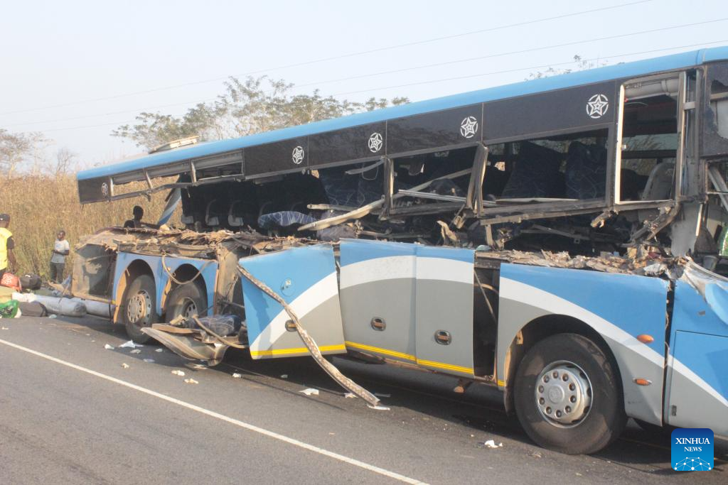 This photo taken on July 24, 2025 shows the damaged bus at the site of a road accident in northwestern Zambia's Solwezi District. At least seven people were killed and 12 others injured when a public bus rammed into an oncoming truck in northwestern Zambia's Solwezi District, police have said. (ZANIS/Handout via Xinhua)