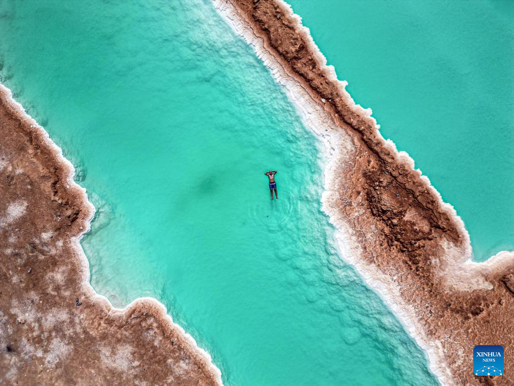 An aerial drone photo taken on July 28, 2025 shows a tourist floating on a salt lake at Siwa Oasis in Matrouh Governorate, Egypt. Siwa Oasis lies in Egypt's western desert, some 800 kilometers from Cairo. There are many natural salt lakes on which people can float with no effort due to high salt concentration. (Xinhua/Ahmed Gomaa)