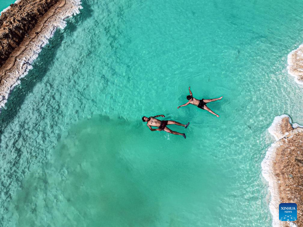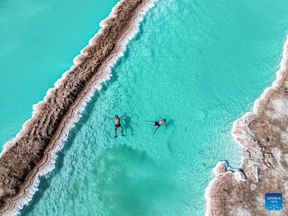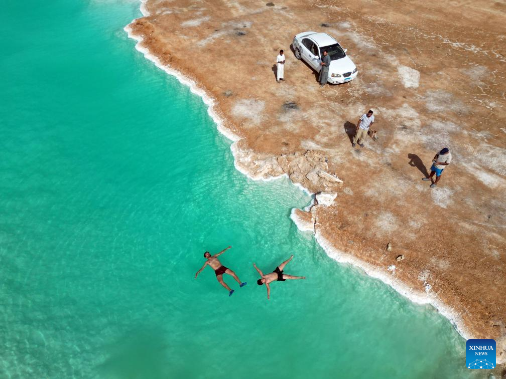 An aerial drone photo taken on July 28, 2025 shows tourists floating on a salt lake at Siwa Oasis in Matrouh Governorate, Egypt. Siwa Oasis lies in Egypt's western desert, some 800 kilometers from Cairo. There are many natural salt lakes on which people can float with no effort due to high salt concentration. (Xinhua/Ahmed Gomaa)
