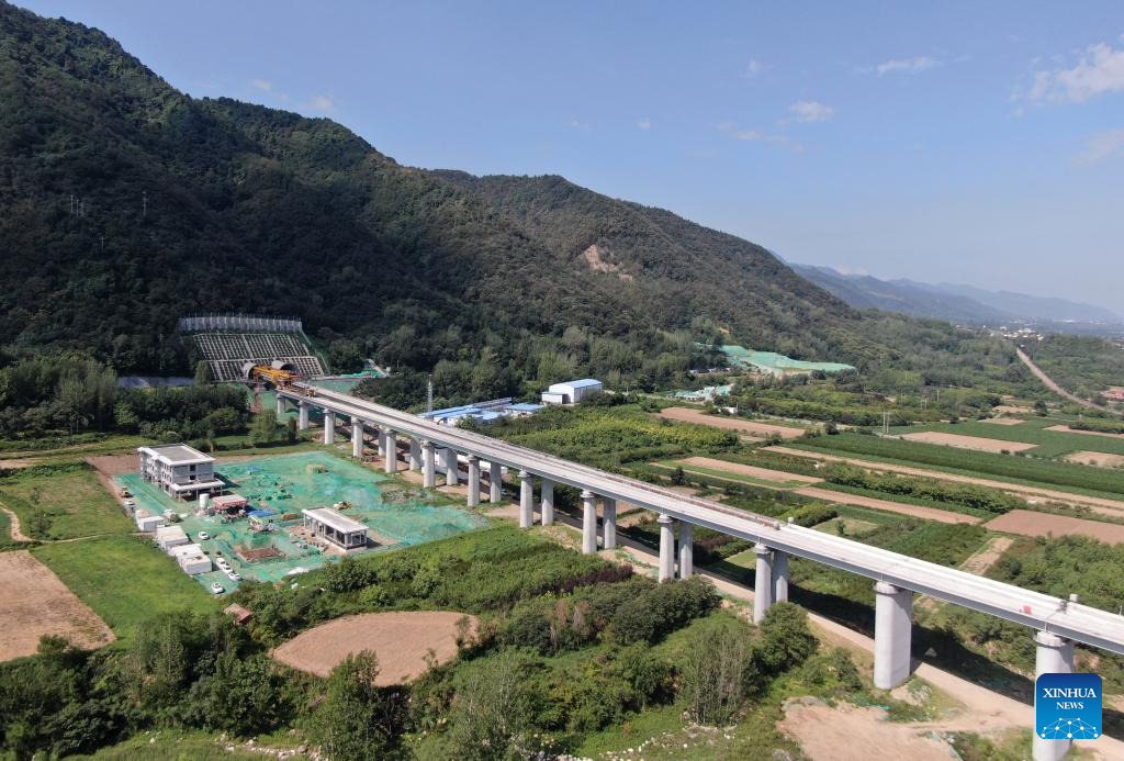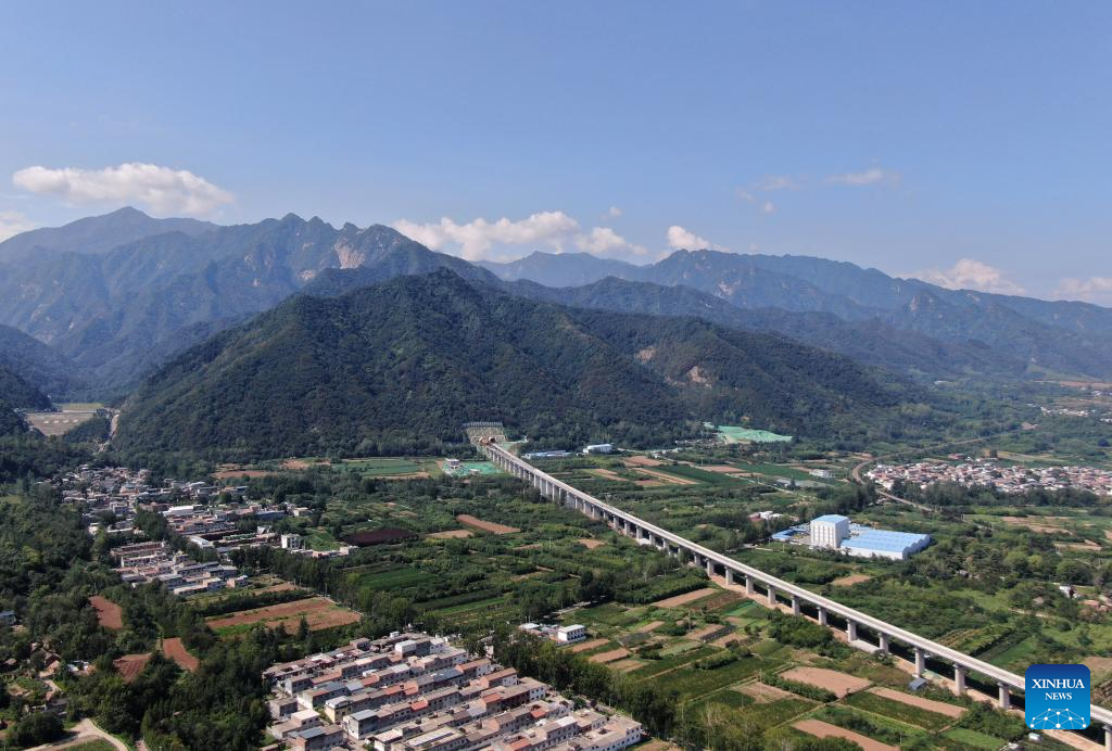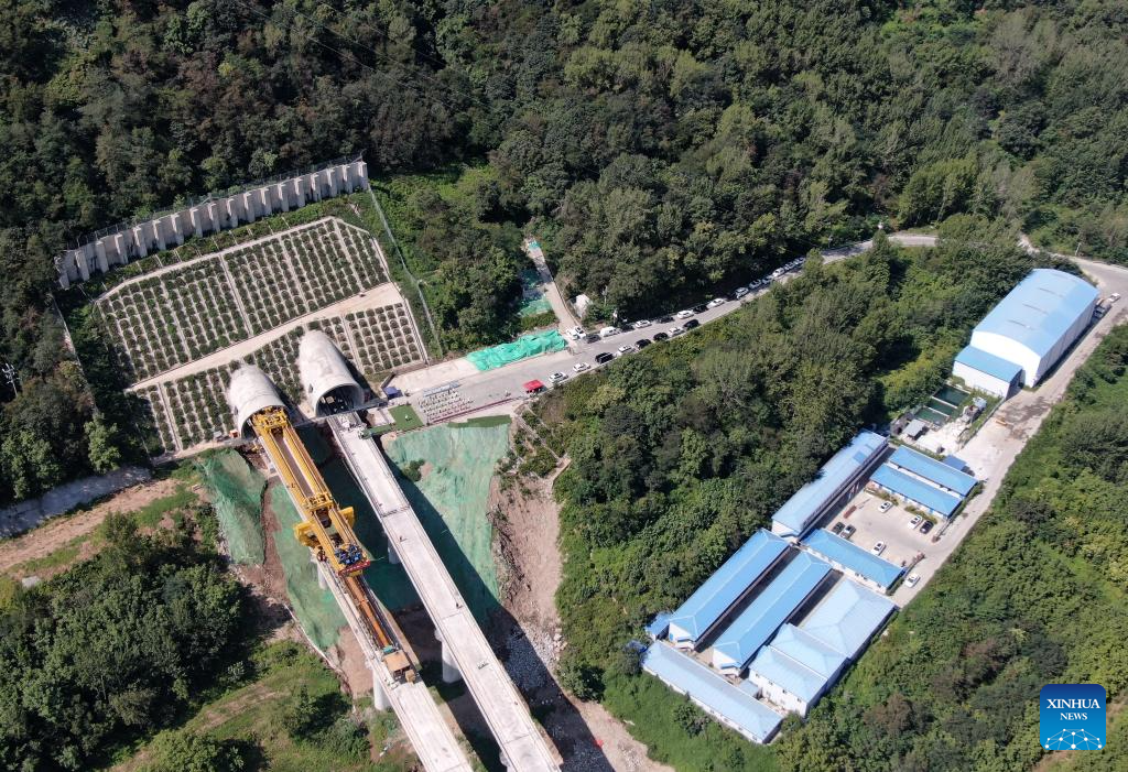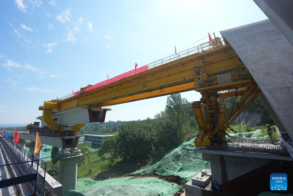 Workers erect the last box girder at the construction site of a mega bridge along the Xi'an-Ankang High-Speed Railway in northwest China's Shaanxi Province, July 28, 2025. All box girder erection tasks for bridges along the Xi'an-Ankang High-Speed Railway have been completed as of Monday, laying a solid foundation for the rest of the construction.The rail line spans 171 kilometers with a designed speed of 350 kilometers per hour. When in operation, it will significantly facilitate travel for residents along the route. (Xinhua/Li Yibo)