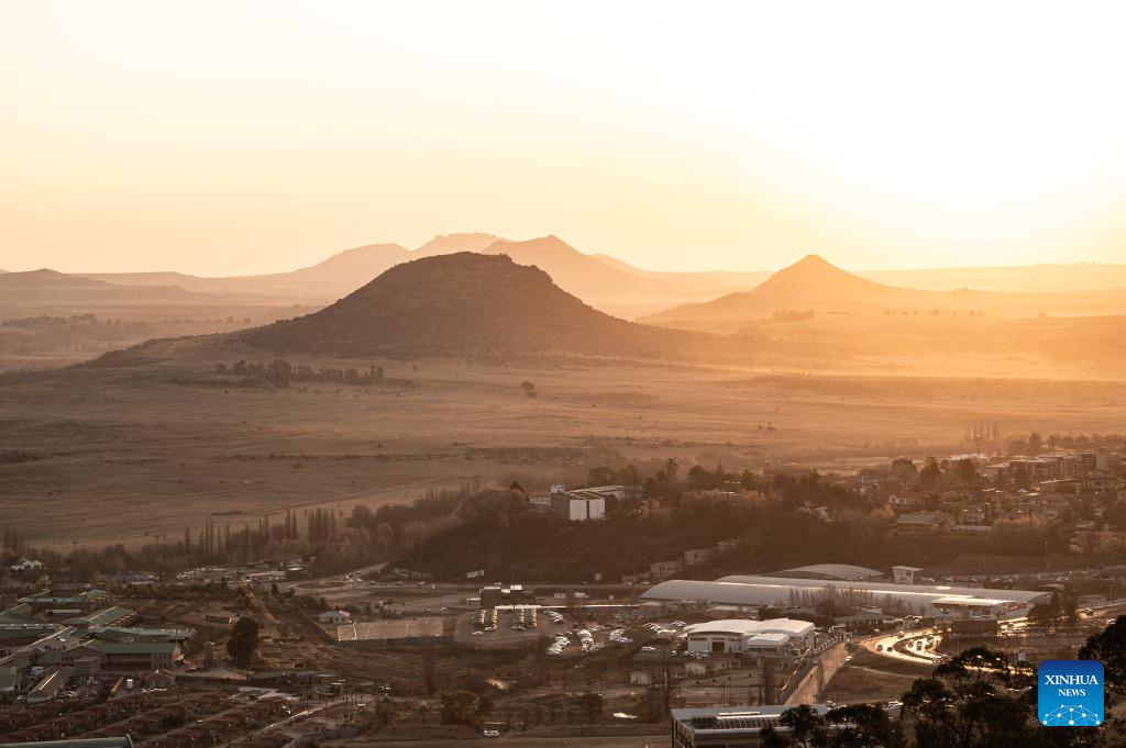 This photo taken on July 30, 2025 shows the sunset view of Maseru, Lesotho. Lesotho is renowned for its traditional Basotho culture, mountainous landscapes, and distinctive hat-shaped architecture. (Xinhua/Wang Guansen)