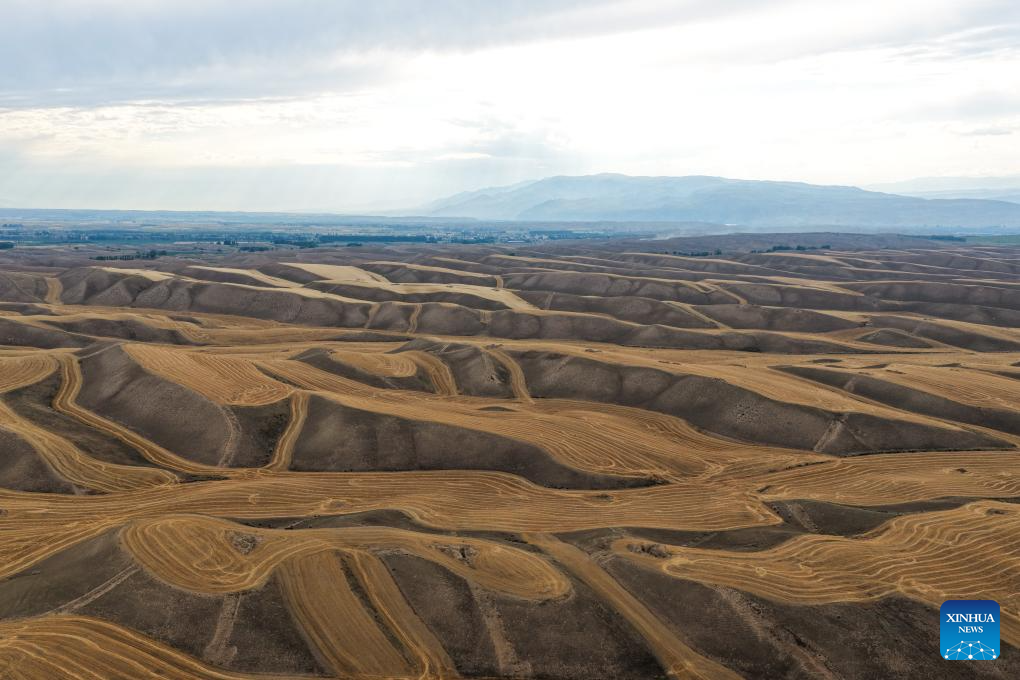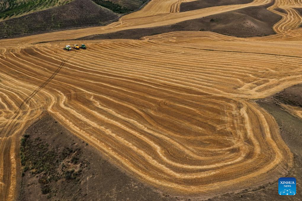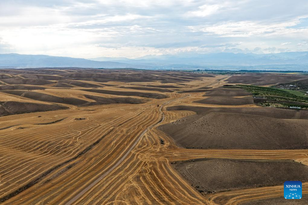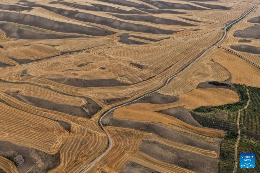 An aerial drone photo taken on July 31, 2025 shows wheat fields in Tekes County, Ili Kazak Autonomous Prefecture, northwest China's Xinjiang Uygur Autonomous Region. Mature wheat is ready for harvest in Tekes. Local farmers are seizing favorable weather conditions to conduct summer harvesting. (Xinhua/Zhao Yusi)