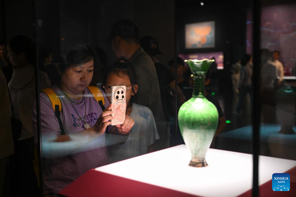 People take photos of exhibits at the Inner Mongolia Museum in Hohhot, north China's Inner Mongolia Autonomous Region, July 30, 2025. (Xinhua/Bei He)
