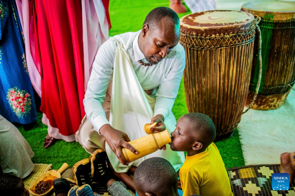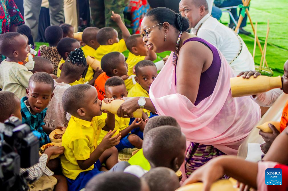 A guest serves milk to a child during a national harvest day celebration in Kicukiro District, Rwanda, Aug. 1, 2025. Rwanda on Friday celebrated its national harvest day, also known as Umuganura. The celebration at the village level brought community members to reflect on their shared identity. It featured traditional music, dancing, and feasting, while also providing a platform to showcase produce from different economic sectors and to recognize Rwandans for their hard work. (Photo by Cyril Ndegeya/Xinhua)