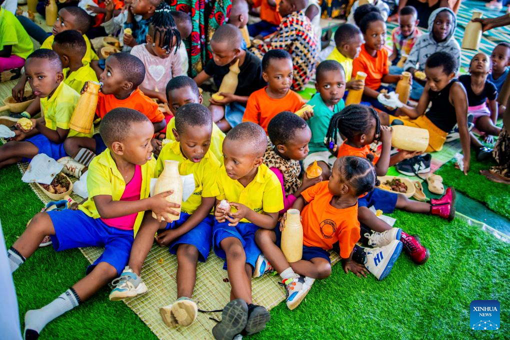 Children share and enjoy milk during a national harvest day celebration in Kicukiro District, Rwanda, Aug. 1, 2025. Rwanda on Friday celebrated its national harvest day, also known as Umuganura. The celebration at the village level brought community members to reflect on their shared identity. It featured traditional music, dancing, and feasting, while also providing a platform to showcase produce from different economic sectors and to recognize Rwandans for their hard work. (Photo by Cyril Ndegeya/Xinhua)