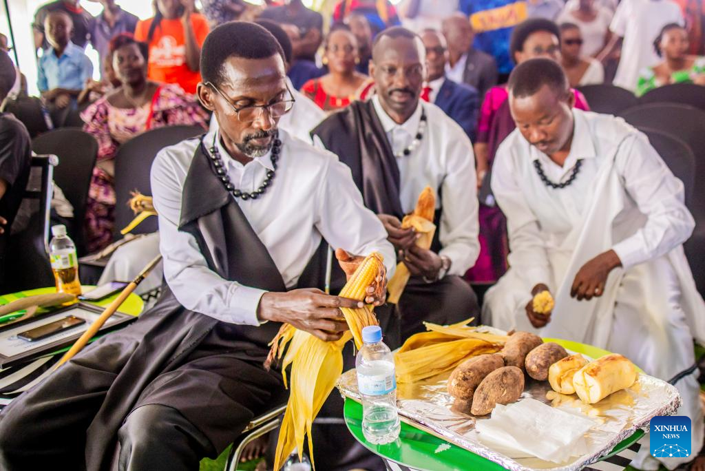 Guests wearing Rwanda's traditional attires share maize, sweet potatoes, and cassava during a national harvest day celebration in Kicukiro District, Rwanda, Aug. 1, 2025. Rwanda on Friday celebrated its national harvest day, also known as Umuganura. The celebration at the village level brought community members to reflect on their shared identity. It featured traditional music, dancing, and feasting, while also providing a platform to showcase produce from different economic sectors and to recognize Rwandans for their hard work. (Photo by Cyril Ndegeya/Xinhua)