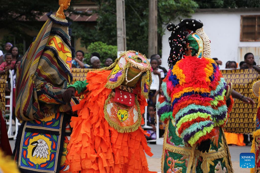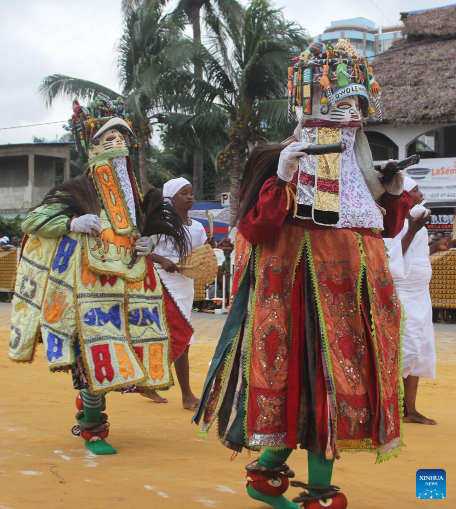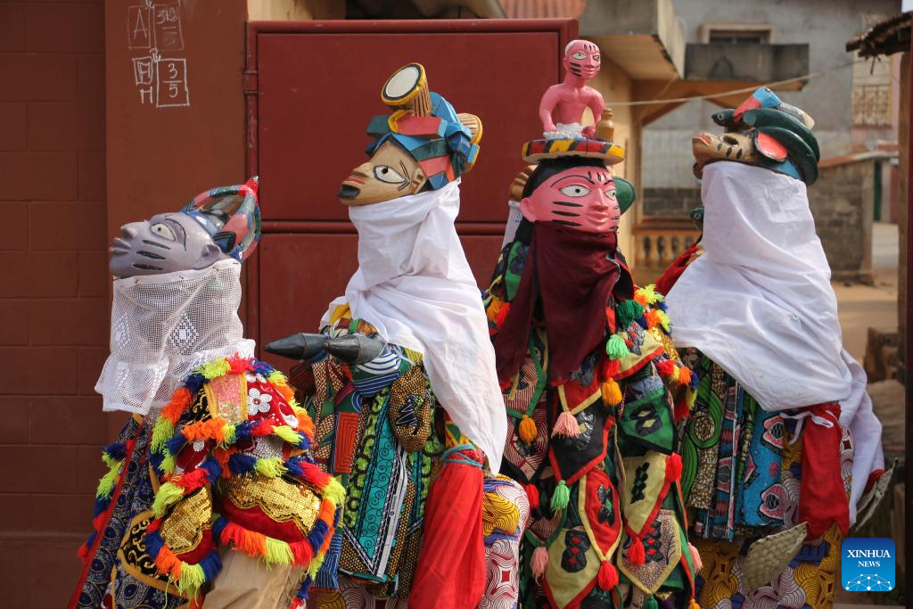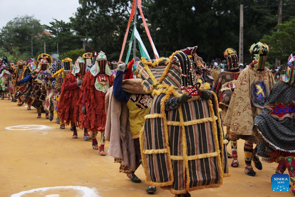 People in costumes perform in a mask parade during the Porto Novo Mask Festival in Porto Novo, Benin, Aug. 3, 2025. The festival was held here from Saturday to Sunday to showcase the art and culture of Benin's traditional religion Vodun through a mask parade, concerts, seminars and other activities. (Photo by Seraphin Zounyekpe/Xinhua)
