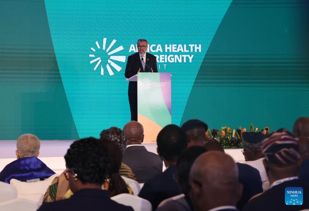 World Health Organization Director-General Tedros Adhanom Ghebreyesus speaks at the Africa Health Sovereignty Summit in Accra, Ghana, on Aug. 5, 2025. The Africa Health Sovereignty Summit opened in Accra on Tuesday with a call to reimagine global health governance amid a rapidly shifting geopolitical and economic landscape. (Xinhua/Seth)