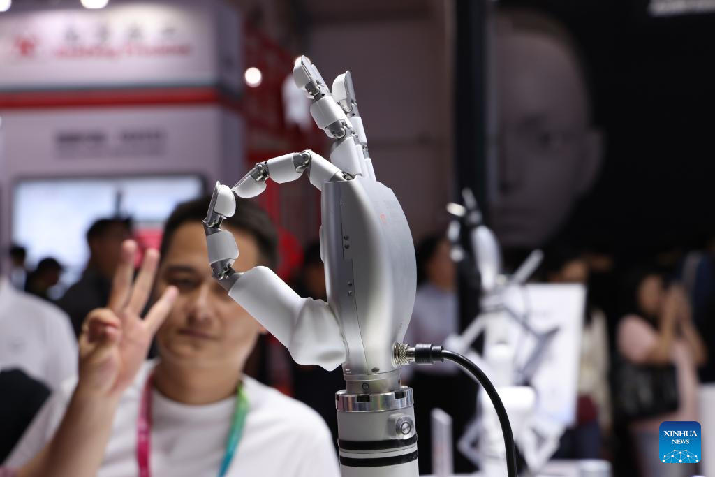Visitors look at a robot hand at the 2025 World Robot Conference (WRC) in Beijing, capital of China, Aug. 8, 2025. The 2025 WRC that kicked off on Friday in Beijing unveiled future development trends of embodied intelligent robots, focusing on fields such as cognition, decision-making and safety.