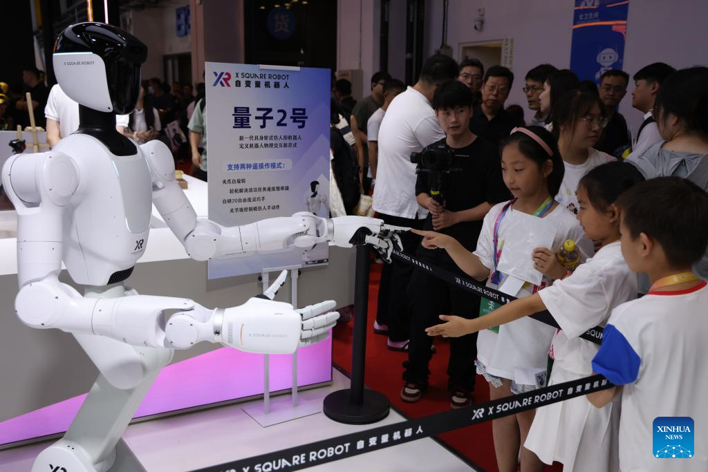 Visitors interact with a Quanta X2 robot from X Square Robot at the 2025 World Robot Conference (WRC) in Beijing, capital of China, Aug. 8, 2025. The 2025 WRC that kicked off on Friday in Beijing unveiled future development trends of embodied intelligent robots, focusing on fields such as cognition, decision-making and safety.