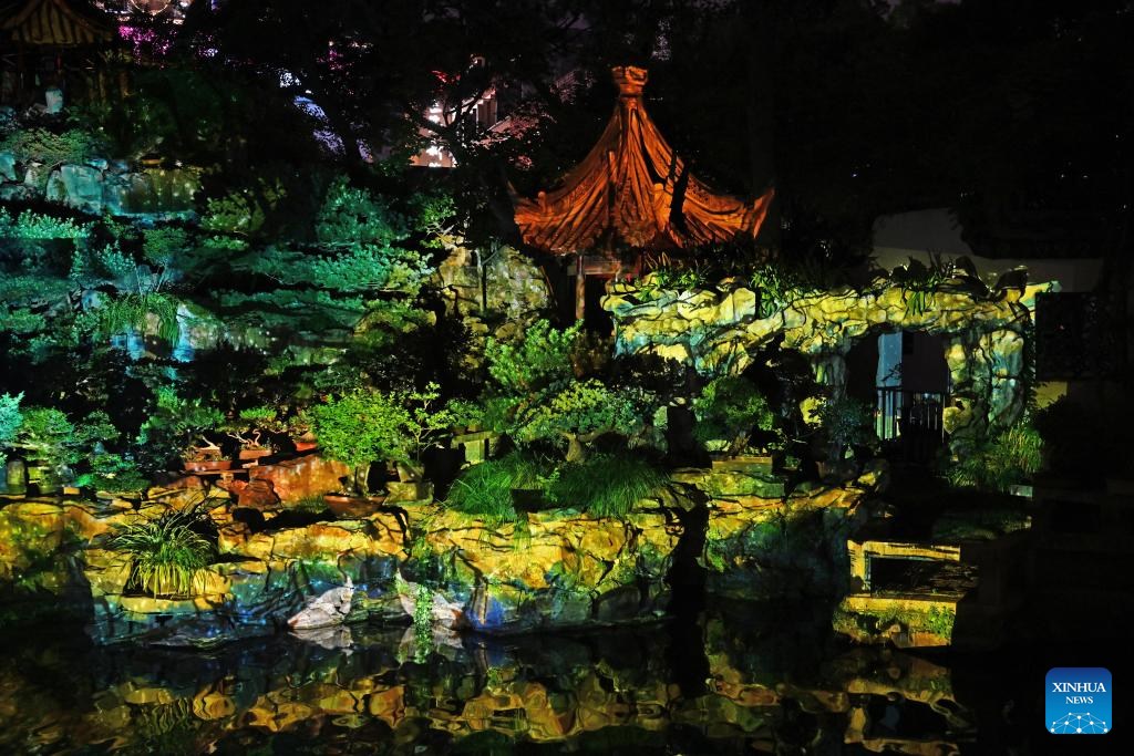 This photo taken on Aug. 8, 2025 shows a night view of Yuyuan Garden in Shanghai, east China. Yuyuan Garden, a historic and cultural landmark in Shanghai, began offering night tours on Friday. (Xinhua/Liu Ying)